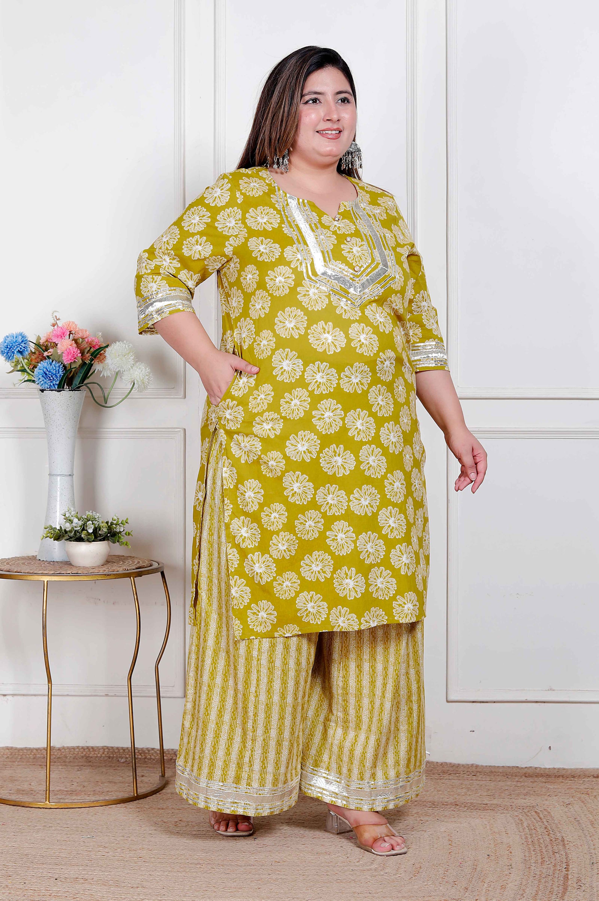 Flaunt your grace with this yellow kurta set from Miravan . Made from high-quality cotton, the kurta features three fourth sleeves, a keyhole neck and a printed pattern. It is paired with a mid-waisted palazzo and a gota work all over . Style it with minimal jewellery and sandals to complete the ensemble