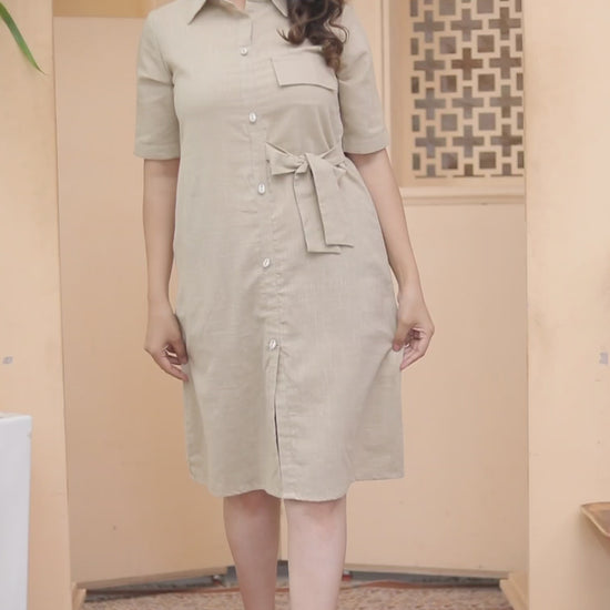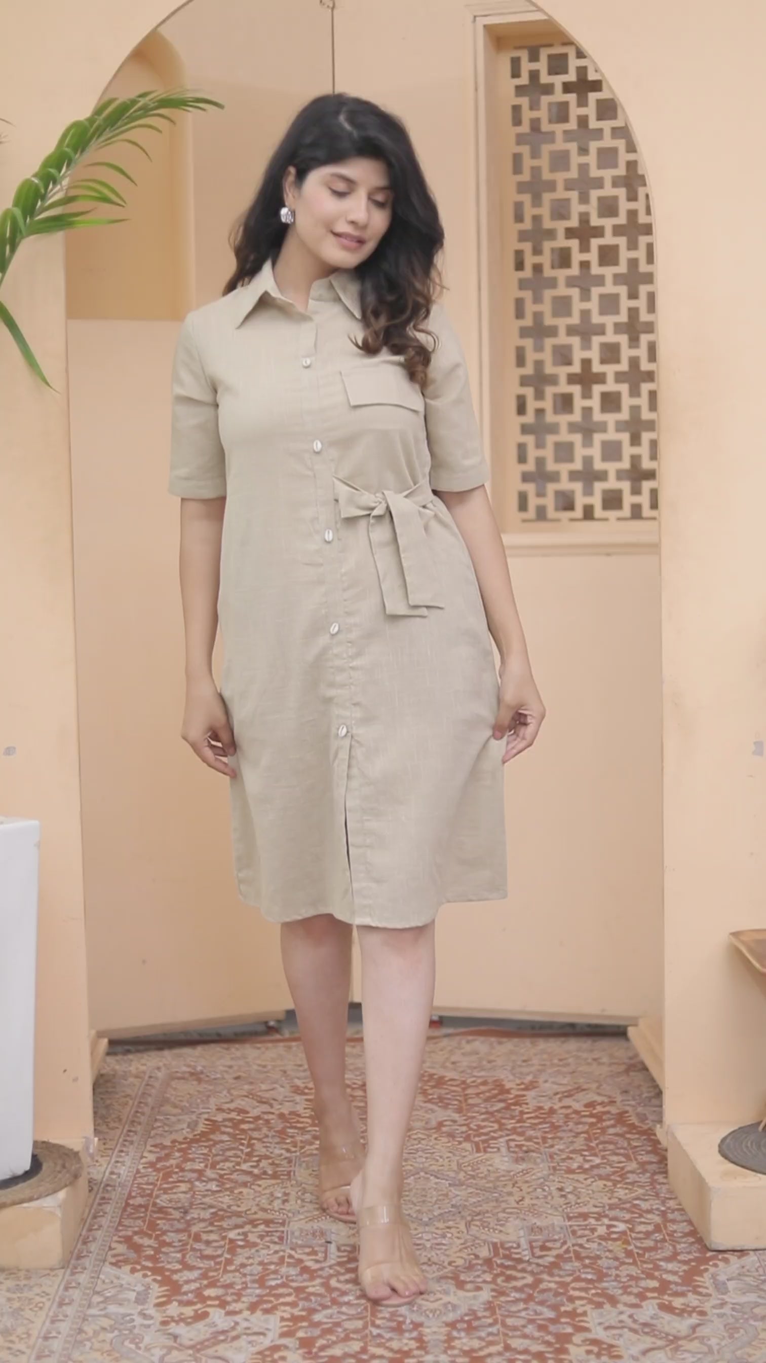 Own The Party-Chic Vibe with This Showoff Beige Flex cotton A-Line Dress with Belt, Designed with Shells-Down Detailing and Side Pockets. Ideal For Day Wear, Brunches - Pair with White Sneakers Or Wedges For A Modern, Relaxed Style.