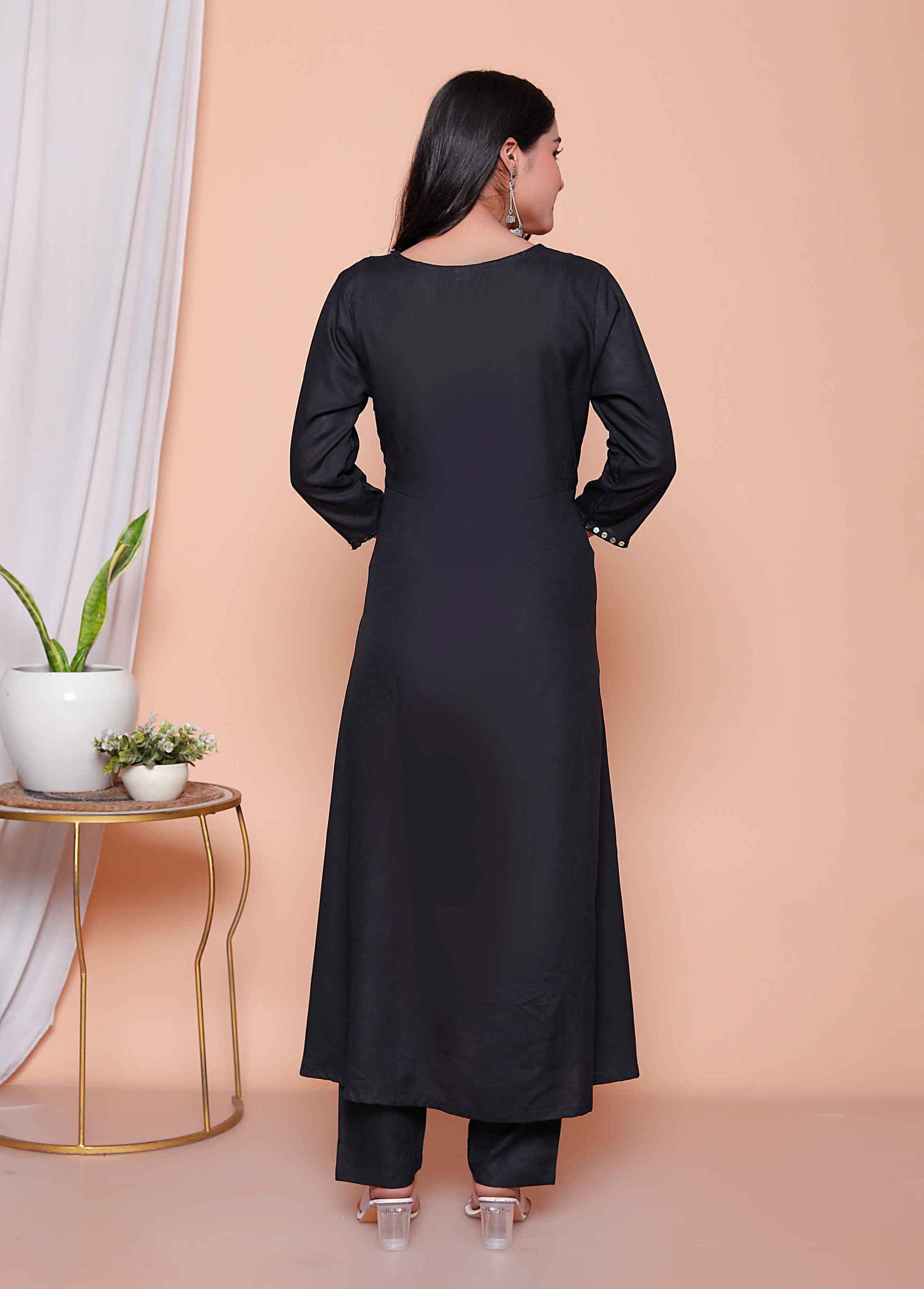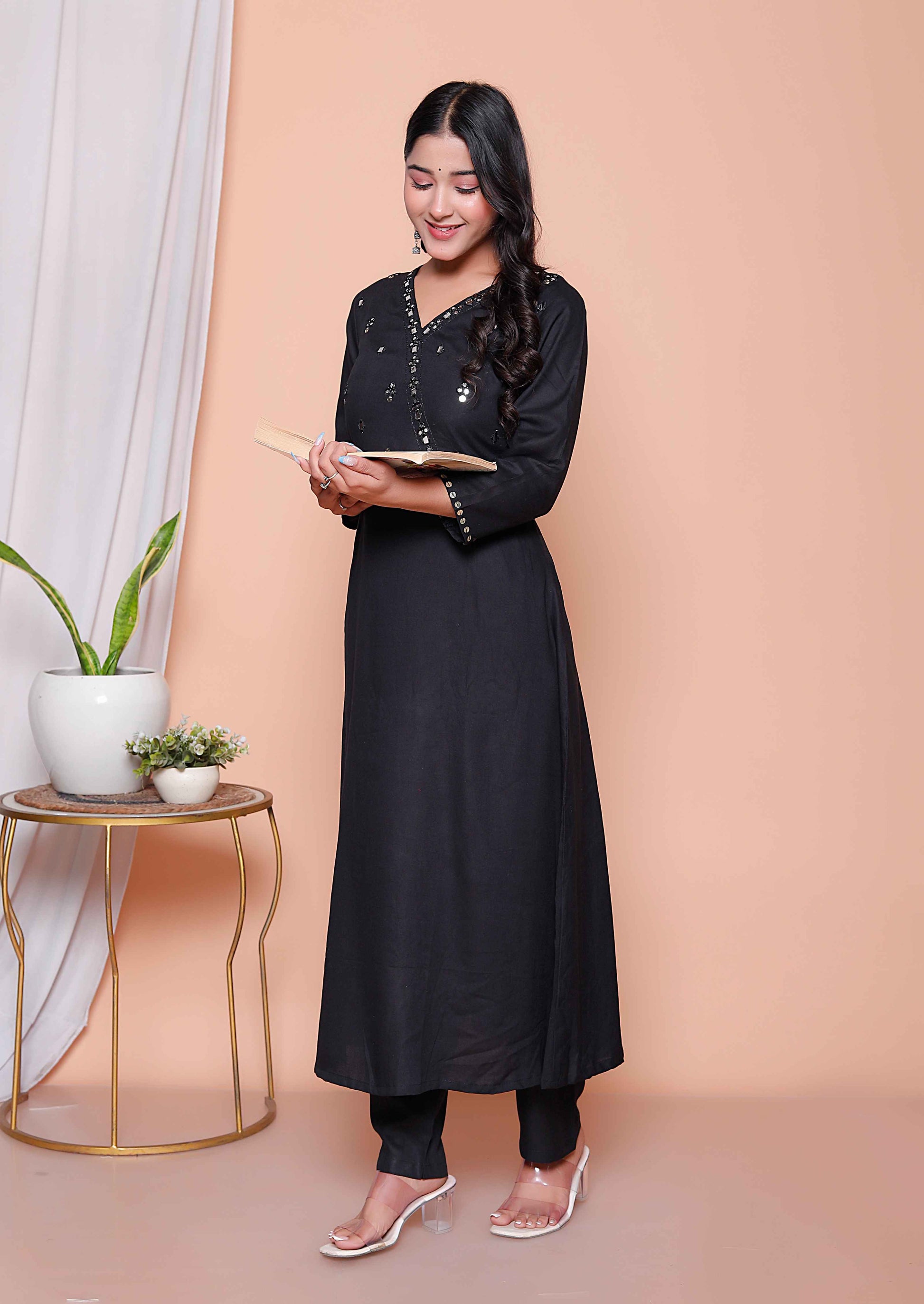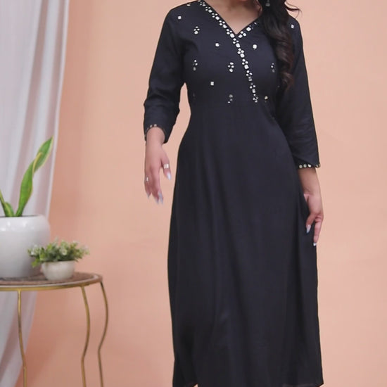 Top Details : Fabric :Rayon Colour :Black Work :Mirror Work Neck Line :V/Neck Length :45 Inch