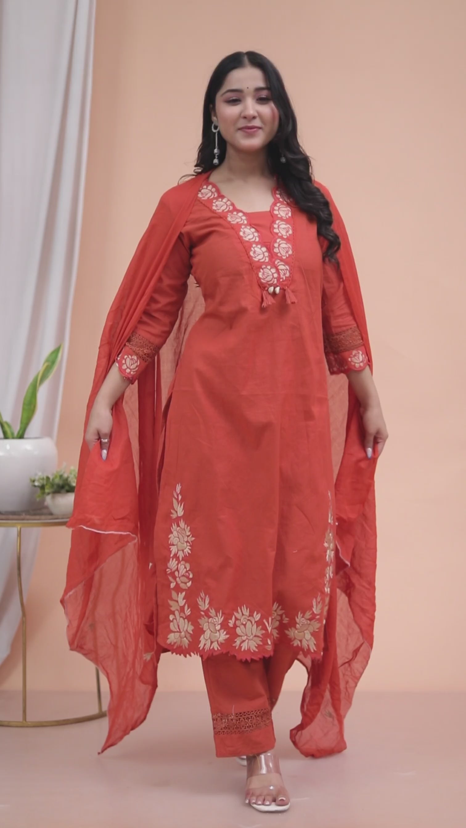 Rust Neck Embroidered Kurta with Palazzo and Dupatta Set, straight Knee length kurta and straight hem, has a V-neck, three-quarter regular sleeves, solid Palazzo elasticated waistband, slip-on closure, embroidered dupatta, has a taping border.