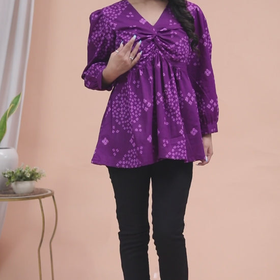 Level up your look with this Purple Bandhani Printed Butterfly Style top from Miravan. Crafted from pure cotton, it is finished with a Balloon Sleeve. Complete the look with minimalistic jewellery and stylish heels.